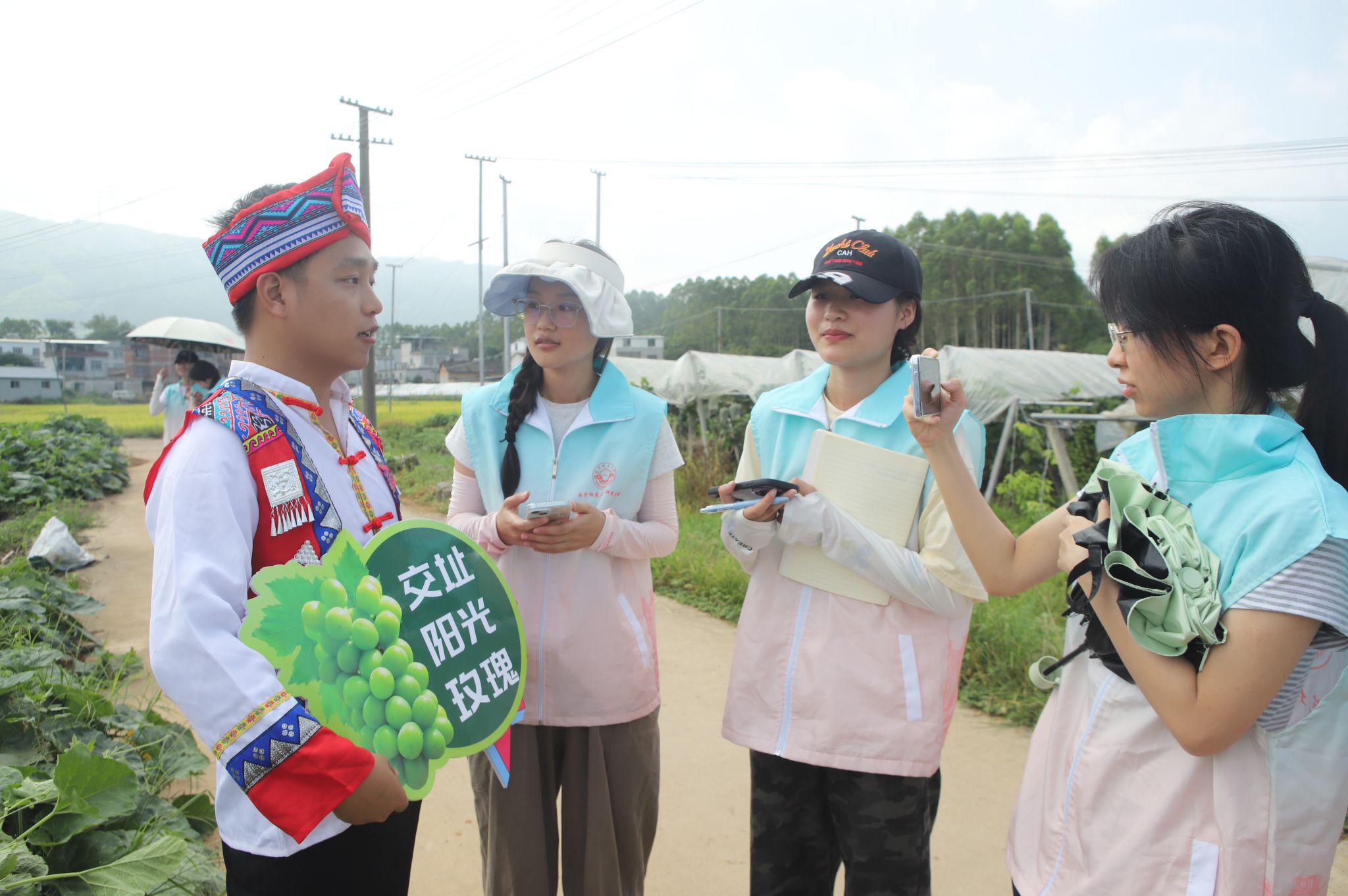 7月15日,实践团走进交址村阳光葡萄园示范基地,协助拍摄开园宣传视频。成员们通过参与出镜和打卡园区特色景观,生动展现了葡萄园的生态魅力。同时,通过对果农和工作人员的采访调研,实践团为当地优化产业结构提供了青年视角的建议。